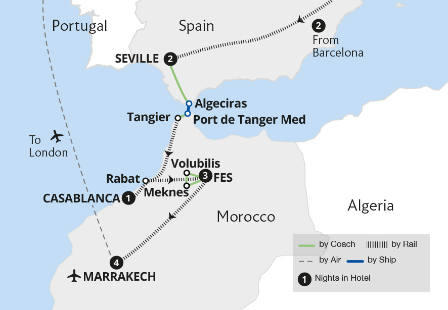 Follow the tracks of the ancient Moors from the shores of Spain to mystical Moroccan cities. Discover the diverse architecture of Barcelona and the treasures of Andalucía's capital, Seville, before crossing the Strait of Gibraltar to Morocco. Soak up Morocco's flavours in Casablanca, Rabat, Fes, Meknes and Marrakech, and experience its rich...