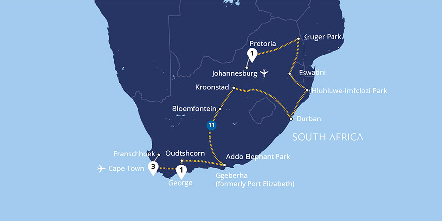 Discover the highlights of South Africa as we journey aboard the luxurious Blue Train from Cape Town to Pretoria. Ride to the top of Table Mountain, meet the friendly African penguins of Boulders Bay, and sample wines amid the stunningly scenic Stellenbosch Valley winelands. This spectacular holiday also includes a visit to Kimberley, South...