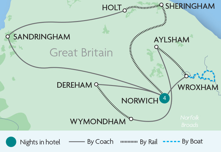 Discover the great city of Norwich on a guided tour, and explore the meandering waterways and famous heritage railways of Norfolk. From our base in historic Norwich, we enjoy a guided tour of this culture-rich city before scenic journeys on the Mid and North Norfolk railways, a cruise through the Norfolk Broads on a Mississippi paddle boat, and a...