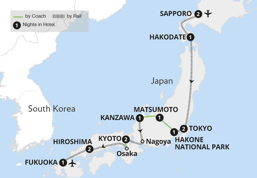 Explore Japan from top to toe on an epic overland expedition from Hokkaido in the north to Kyushu in the south. Experience all Japan has to offer, while journeying on ultramodern bullet trains. Compare Sapporo's scenic setting to Tokyo's neon-lit streets, and discover this captivating country's history through its tranquil temples, a visit...