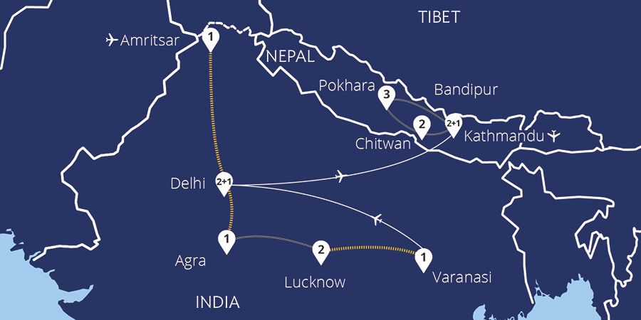 Embark on an incredible holiday of dazzling temples, emblematic animals and awe-inspiring experiences during a wonderful exploration of India and Nepal. Delight at the glistening Golden Temple in distinguished Amritsar, before uncovering the history of India's capital. After marvelling at the revered Taj Mahal, continue east to the important...
