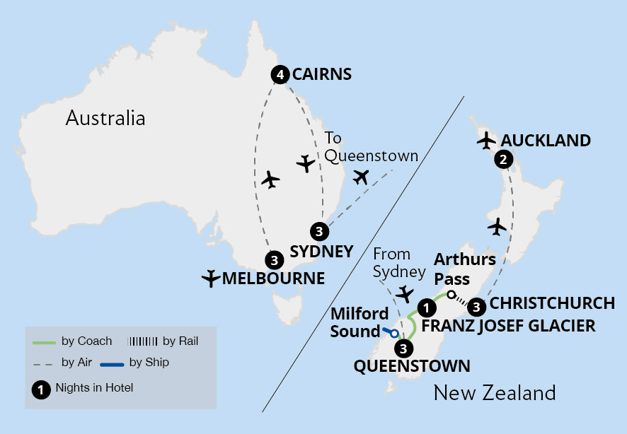 Embark on a journey of a lifetime, witnessing iconic landmarks, spectacular natural wonders and top locations throughout Australia and New Zealand. Encounter cities like Melbourne and Sydney in southern Australia and the many allures of the tropical north, including the UNESCO-listed Great Barrier Reef. Then, explore New Zealand's North and South...