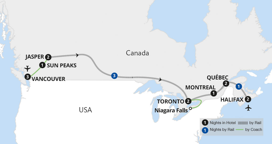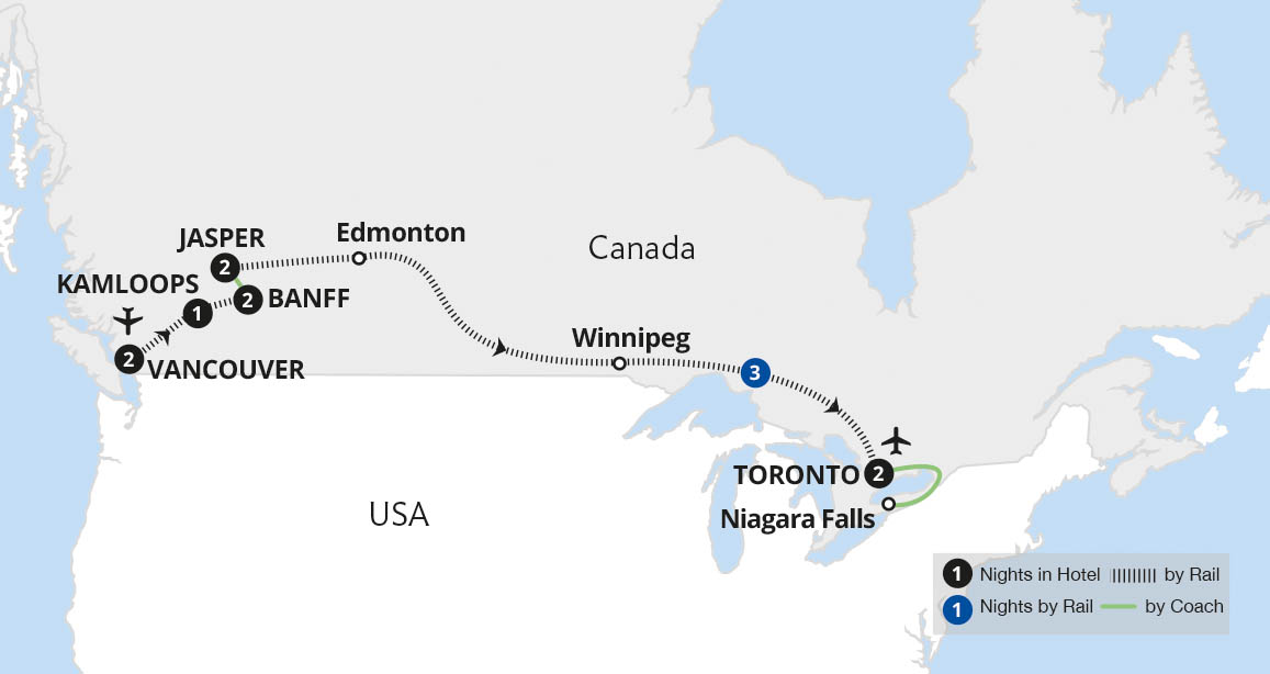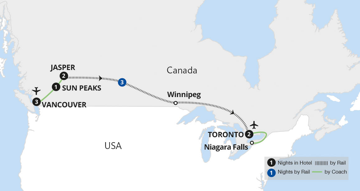 Uncover Canada's most amazing landscapes on this journey from the Pacific coast to the Great Lakes. Our exploration begins with a guided tour of Vancouver before touring the stunning Rocky Mountains from the mountain town of Jasper. Here, we admire awe-inspiring vistas including the Maligne River valley. An epic three-night journey from...