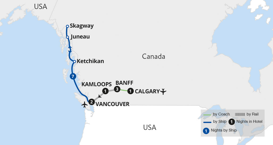 A spectacular discovery of natural wonders awaits on this exploration by land and sea. From the mountain town of Banff in the Canadian Rockies, we marvel at the spellbinding beauty of Lake Louise before boarding the iconic Rocky Mountaineer. This fantastic rail journey transports us to Vancouver, where we set sail on an unforgettable ...