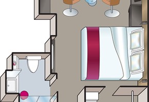 These en-suite cabins are stylish and impressively spacious at 17.5 squre metres, with a panoramic window balcony, walk-in wardrobe and seating area.