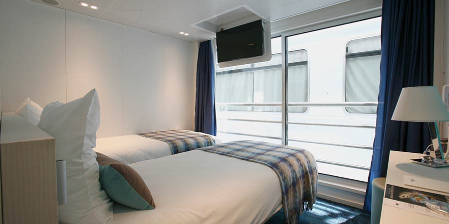 These cabins sit on the middle level and feature panoramic windows as well as a French balcony, a choice of double or twin beds, flat-screen television, individual climate control, an en-suite bathroom with shower and W.C, a hairdryer, direct dial telephone and in-room safe.