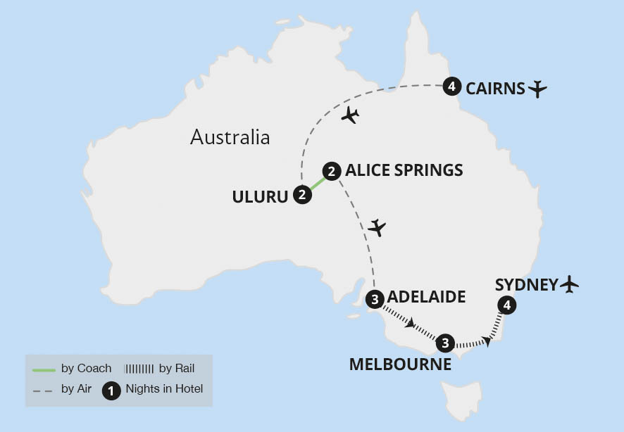 Our epic Australian adventure has taken us from the sensational Great Barrier Reef and the sacred site of Uluru to the wonderful cities of Adelaide, Melbourne and Sydney. With rides on scenic railroads and a heritage steam train, a catamaran trip into the Great Barrier Reef and an iconic cruise into Sydney harbour, this tour has taken us across thousands of miles of Australia's vast and inspiring land. We touch down in London Heathrow early on Day 21 and you are free to make your way home.