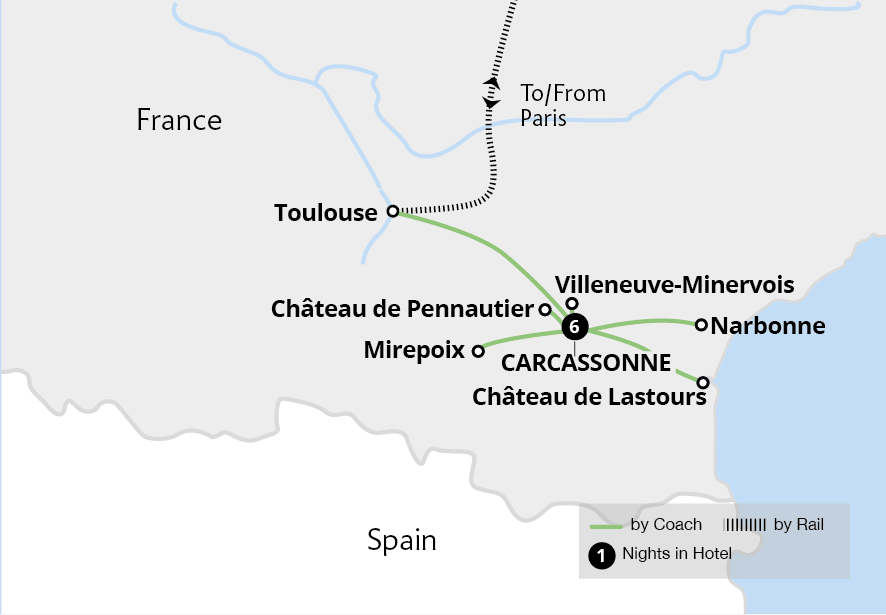 Stroll through Carcassonne's magical walled fortress on a guided tour of the city's medieval delights and uncover the mysterious history of the four hillside Châteaux de Lastours, before discovering the beautiful city of Narbonne. Soak up the atmosphere on a trip to Mirepoix's famed weekly market and savour a delicious lunch and wine tasting at the Château de Pennautier.