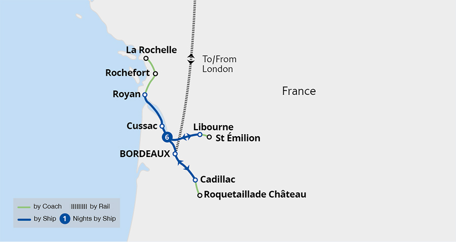 Your holiday begins today as we meet at London St Pancras and join the Eurostar to Paris. From here, we travel by coach and rail through the French countryside to Bordeaux, where we board our ship on the banks of the Garonne River.