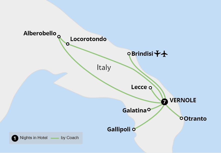 With all of southern Puglia's romantic scenery and undiscovered charms ahead, your Italian holiday begins this morning at London Heathrow. As you arrive, meet the Tour Manager and your group of fellow travellers, and together, board the flight to Brindisi Airport*, your gateway to Salento.