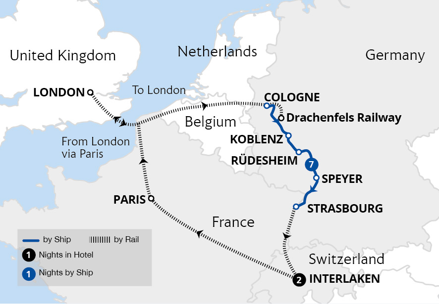Starting from Cologne, our cruise leads us south through the picturesque towns of Koblenz and Boppard, before we sail the breathtaking Rhine Gorge where sensational vistas unfold at every turn. We delve into Heidelberg on a guided tour and wander the winding alleys and half-timbered houses of Strasbourg.