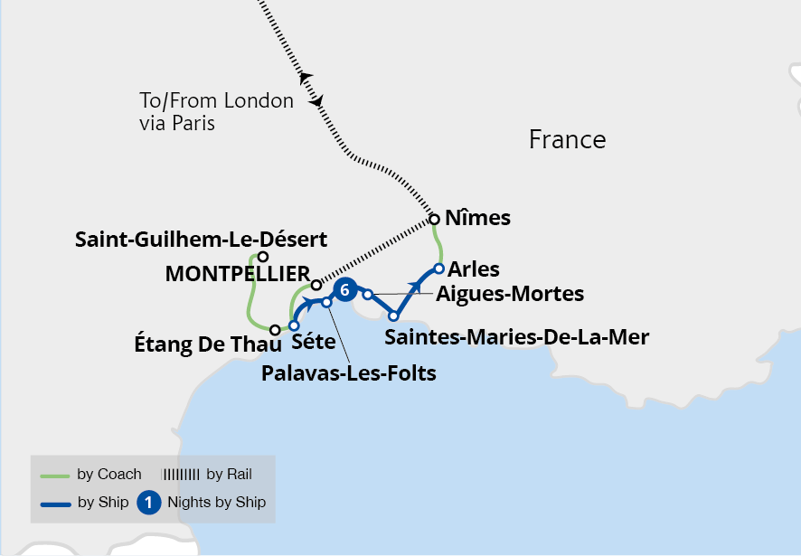 With the delights of France's charming waterways beckoning, your cruise holiday begins this morning at London St Pancras International. As you arrive, meet the Tour Manager and your travel group, and together, board the Eurostar to Paris. On arrival in the French Capital, we continue by rail to Montpellier St-Roch.