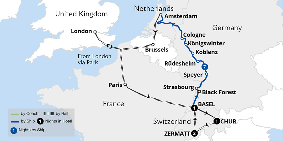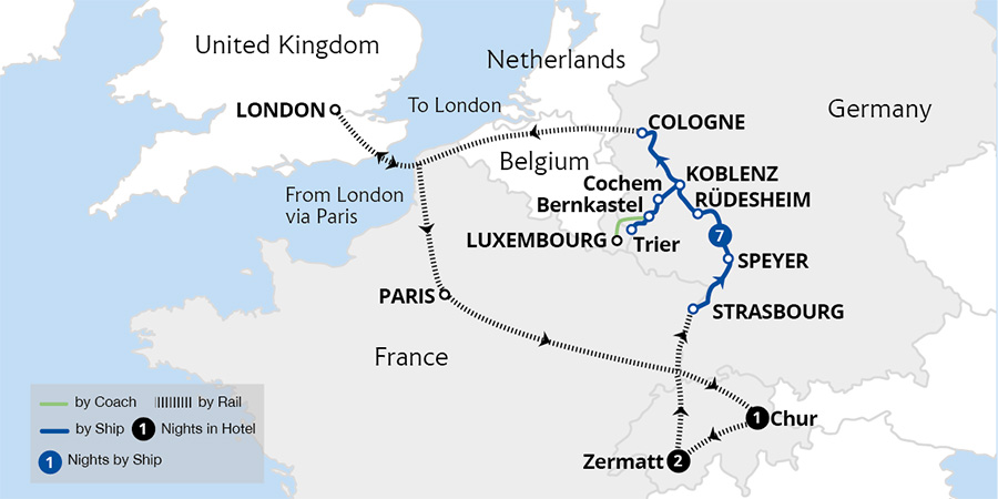 Enjoy one of the world's finest rail journeys aboard the legendary Glacier Express to Zermatt and admire Matterhorn views from the charming Gornergrat Railway. Descending the Alps, set sail on a sensational Rhine cruise, indulging in luxurious amenities and superb service. Enroute, savour incredible vistas of the stunning Rhine Gorge.